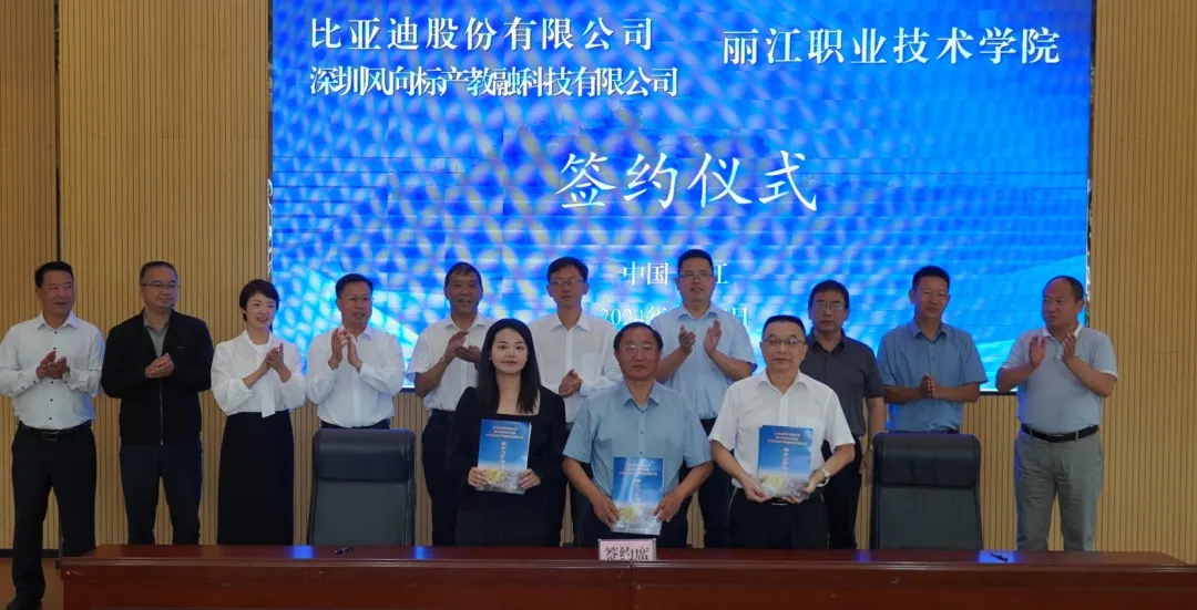2024年8月27日,風向標產教融科技有限公司、比亞迪股份有限公司、麗江職業技術學院就三方共建“比亞迪產業學院”項目達成合作,并在麗江職業技術學院舉行了正式的簽約儀式。此次合作旨在深化產教融合,共育新能源汽車產業高技能人才,構建產教融合新范本。
