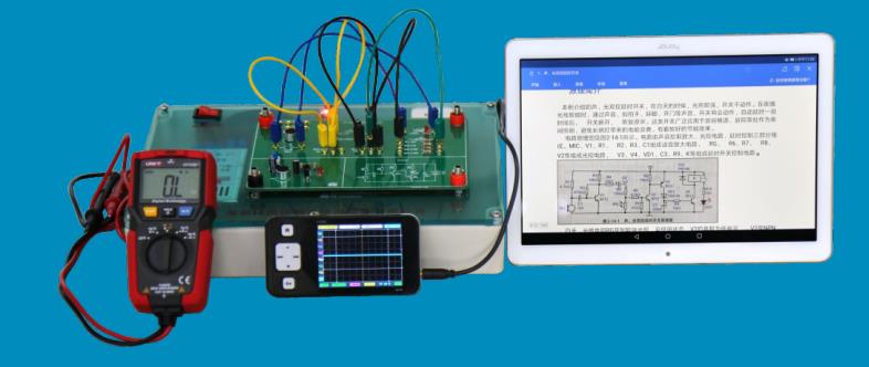 2、配套的有∶帶有各種電壓輸出的通用試驗主板模塊,示波器,萬用表,一字頭螺絲刀,9.8寸平板電腦,兩端帶有香蕉插座的連接線,平板電腦和示波器充電用數據線,電源線。