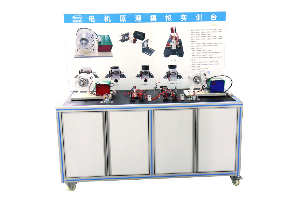 一. 產品簡介電機原理模擬實訓設備采用了直流永磁電機,演繹了直流永磁電機的結構與工作原理,是一款電機學習的基礎入門課的實訓設備。本實訓臺把電機進行透明封裝的設計可讓學生更加清晰了解直流永磁電機的結構與工作原理,讓學生看到電機內部的運轉狀況。主要組成有:直流永磁電機模型(電機、電機控制器)、12V多組繞組直流永磁電機、12V單組繞組直流永磁電機、開關可調電源(帶短路保護)、電機調速器、永磁鐵、檢測