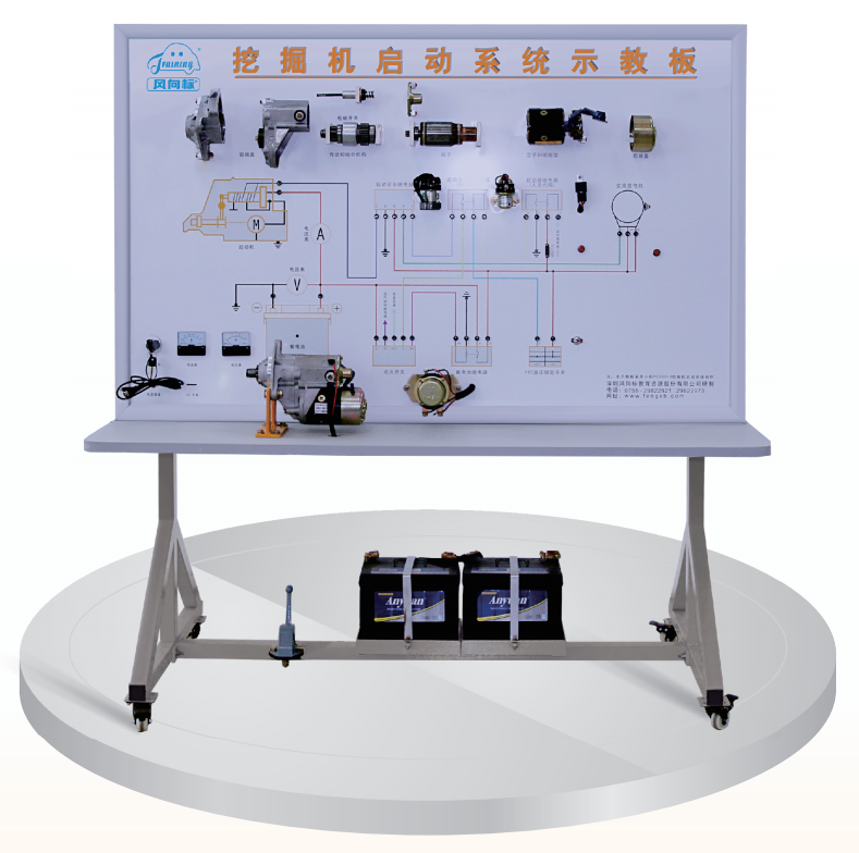 ·示教板面板采用4mm厚耐腐蝕、耐污染、防火、防潮的高級鋁塑板,表面經特殊工藝噴涂底漆處理;面板打印有永不褪色的彩色電路圖,表面噴涂光油;學員可直觀對照電路圖和實物,認識和分析挖掘機起動系統的工作原理。