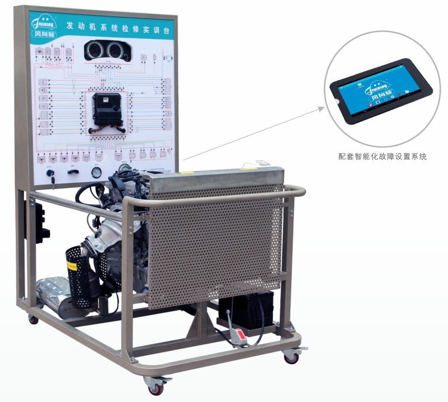 檢測控制面板,組合儀表,發動機控制電腦(ECU),診斷座,點火開關,燃油壓力表,真空壓力表,發動機總成,燃油箱,汽油泵(含汽油泵插頭),油門控制裝置,進、排氣管(帶保護罩),水箱(含不銹鋼保護罩),冷卻電子風扇,蓄電池,繼電器,電源總開關,智能化故障設置和考核系統,移動臺架(帶自鎖腳輪裝置)