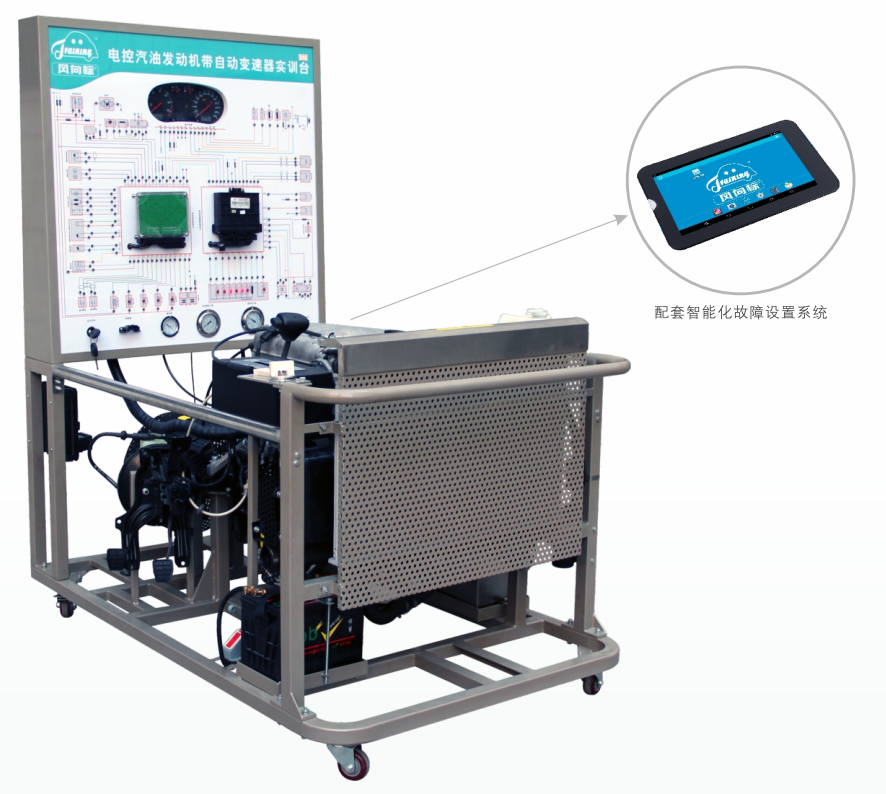 檢測控制面板,組合儀表,發動機和自動變速器控制電腦(ECU)診斷座,點火開關燃油壓力表,主油道壓力表,真空壓力表,發動機總成,自動變速器總成,變速器檔桿總成,燃油箱,汽油泵油門控制裝置,進、排氣管(帶保護罩),制動系統總成,水箱(含不銹保護罩),冷卻電子風扇,蓄電池,繼電器,電源總開關,智能化故障設置和考核系統,移動合架(帶自鎖腳輪)