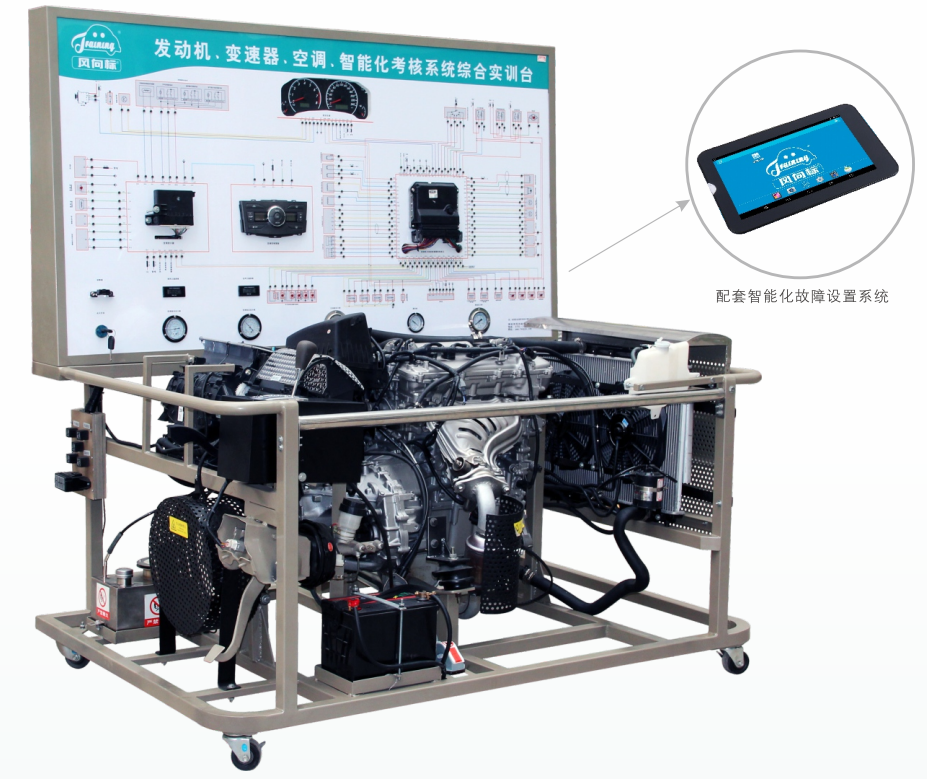 檢測控制面板,組合儀表,發(fā)動機(jī)和自動變速器控制電腦(ECU),空調(diào)控制面板,空調(diào)控制器總成,診斷座,點火開關(guān),燃油壓力表,主油道壓力表,真空壓力表,高壓壓力表,低壓壓力表,數(shù)字式進(jìn)風(fēng)口溫度表, 數(shù)字式出風(fēng)口溫度表,發(fā)動機(jī)總成,自動變速器總成,變速器檔桿總成,空調(diào)蒸發(fā)箱總成,壓縮機(jī)總成,膨脹閥總成,干燥器總成,鼓風(fēng)機(jī)總成,冷凝器,燃油箱,汽油泵(含汽油泵插頭),油門控制裝置,進(jìn)、排氣管(帶保護(hù)罩)、三元催化劑、制動系統(tǒng)總成,水箱(含不銹鋼保護(hù)罩),冷卻電子風(fēng)扇,蓄電池,繼電器,電源總開關(guān),智能化故障設(shè)置和考核系統(tǒng),移動臺架(帶自鎖腳輪)