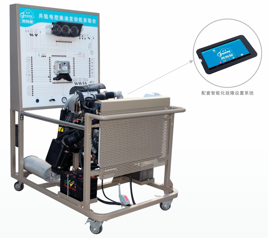 檢測控制面板,組合儀表,發(fā)動(dòng)機(jī)控制電腦(ECU),診斷座,點(diǎn)火開關(guān),電控高壓共軌柴油發(fā)動(dòng)機(jī)總成,燃油箱,油門控制裝置,進(jìn)、排氣管(帶保護(hù)罩)、水箱(含不銹鋼保護(hù)罩),冷卻電子風(fēng)扇,蓄電池,繼電器,電源總開關(guān),智能化故障設(shè) 置和考核系統(tǒng),移動(dòng) 臺(tái)架(帶自鎖腳輪裝置)