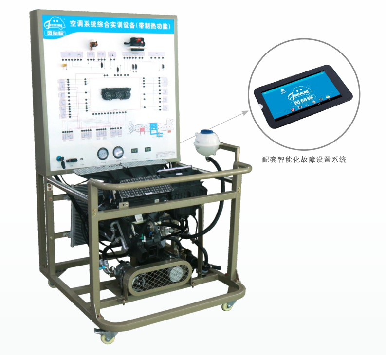 2.由三相電機(jī)做為動(dòng)力源,帶動(dòng)空調(diào)壓縮機(jī)工作。操作空調(diào)控制面板,可真實(shí)演示汽車(chē)自動(dòng)空調(diào)系統(tǒng)的工作過(guò)程以及工作原理。