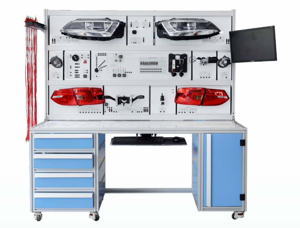 該系統是軟硬件結合的綜合教學實訓系統。課程內容涵蓋汽車燈光系統汽車基礎知識,學生能夠進行接線,接線后系統可以判斷接線是否正確,故障診斷、 虛擬實訓測量, 可實現與實車系統的通訊診斷。每門課程根據實際臺架進行原理講解、三維展示和實驗操作更夠傳授給學生系統化的汽車原理和技術知識等。