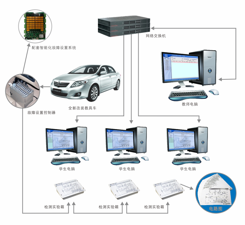 2. 在不改動原車線速的情況下, 利用故障設置終端,通過無線WIFl組網,可設置20臺以上學生檢測終端的故障設置控制器,能對原車各電控系統進行診斷、測量、故障設置等實訓;