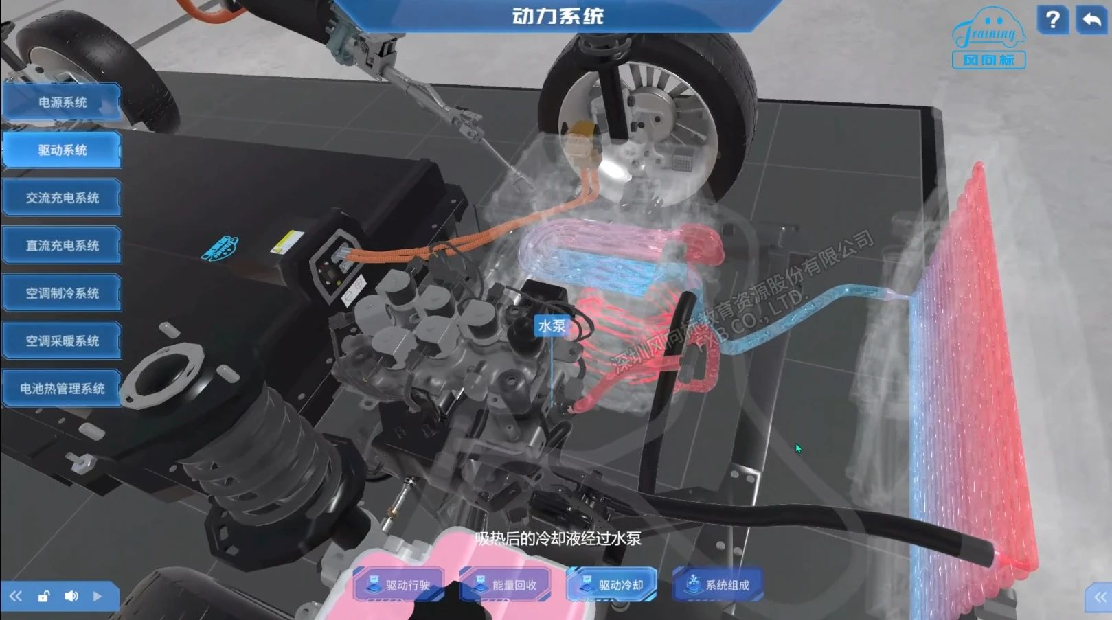 在驅動系統中,系統展示了動力域控制器、配電模塊、電機控制器、驅動電機、減速器、驅動冷卻系統的原理講解與結構組成。