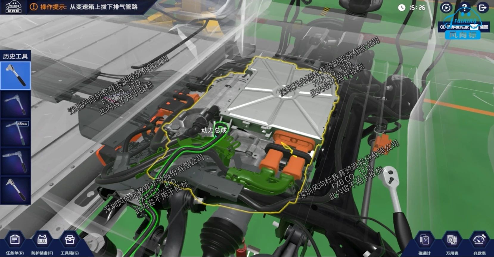 電驅(qū)動總成安裝項目,將工作臺上的電驅(qū)動總成安裝到車輛上,完成連接件安裝、進(jìn)行高壓上電。